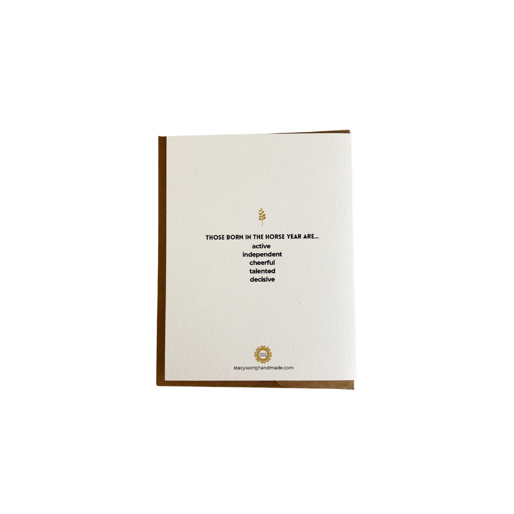 The card backside includes the characteristics of those born in the Horse year.